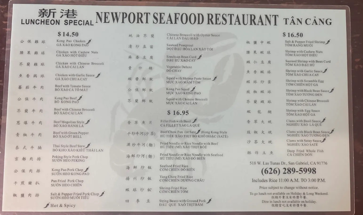 Welcome to the Newport Seafood Restaurant, a haven for seafood lovers nestled in San Gabriel. This classic Chinese eatery elevates the dining experience with an extensive menu that highlights the rich flavors of the ocean.